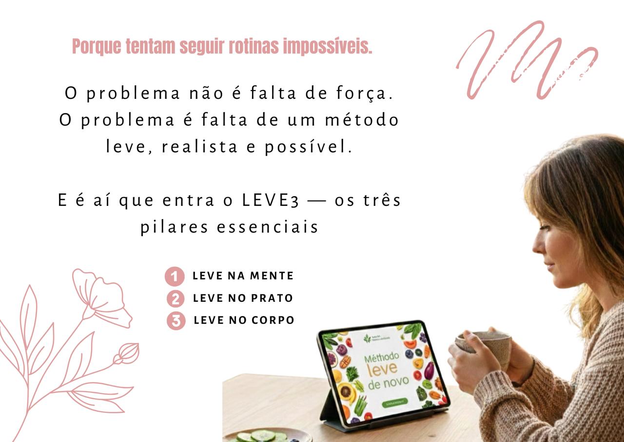Não. O método foca na reeducação alimentar leve (Pilar Leve no Prato) e no controle da ansiedade (Pilar Leve na Mente). Você aprenderá a fazer combinações inteligentes de alimentos que saciam e secam, sem a necessidade de dietas radicais, que são insustentáveis na vida real.